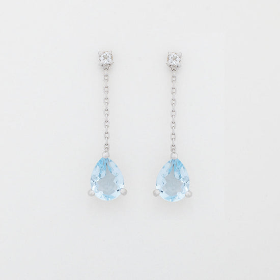 An elegant dangle earring with a tiny white topaz gemstone atop a pear cut light Blue topaz stone. The perfect 'something blue' for any bride, or perfect for any special day.